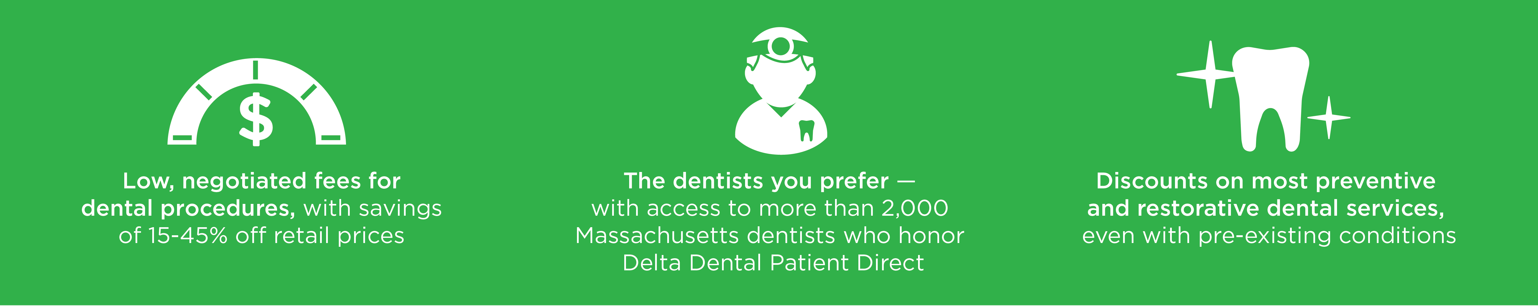 The Delta Dental Patient Direct Discount Card provides discounted services when visiting an in-network dentist. As the leading dental benefits provider in Massachusetts, Delta Dental negotiates discounted rates with in-network dentists, bringing significant savings directly to you.