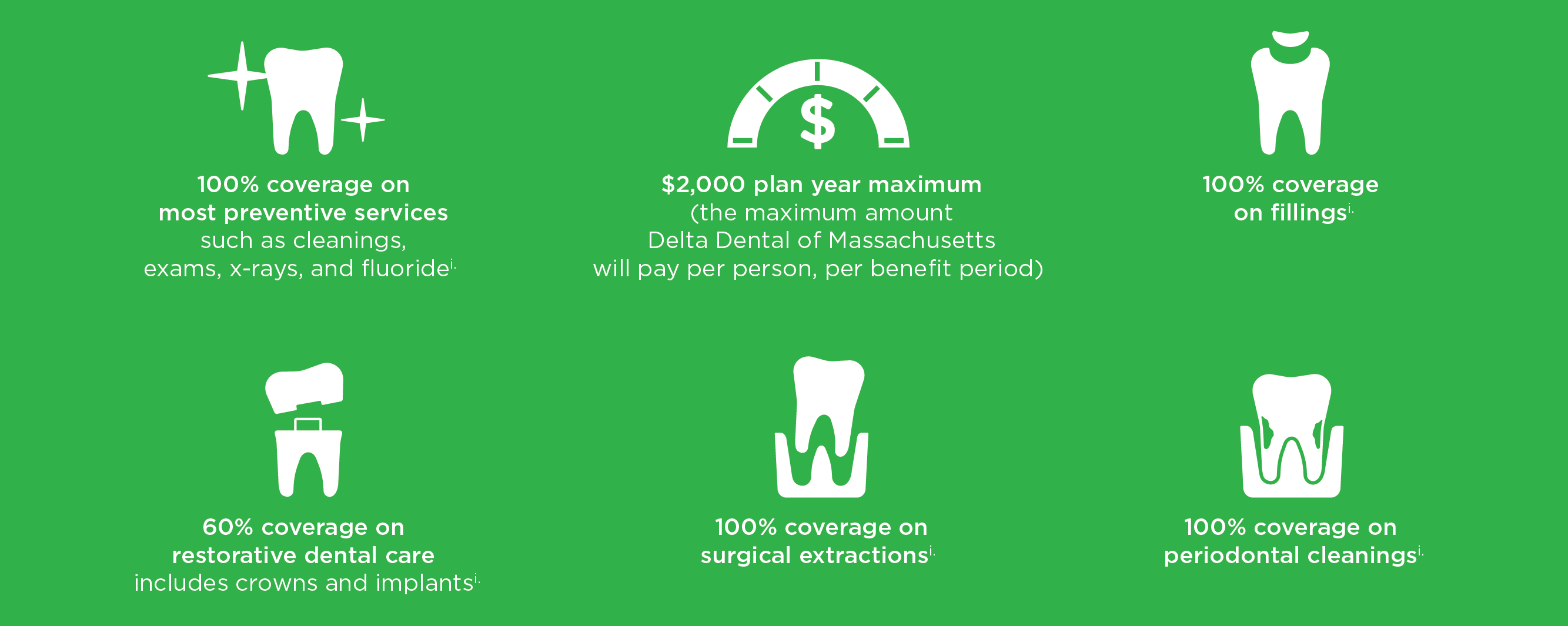 Coverage percentages displayed in the tables above represent the percentage of the allowed amount that is covered by Delta Dental of Massachusetts.